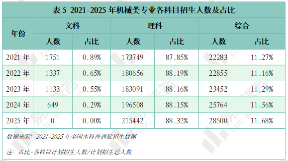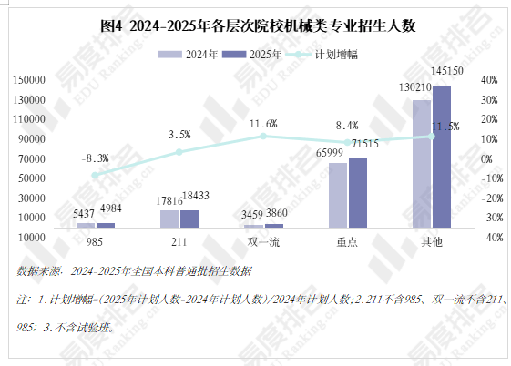 机械类专业被誉为“工科之母”,正在上世纪鼎力奉行机械化时红极一时,后期陷入长达几十年的缄默期。风水轮番转,跟着新能源汽车、机械人财产成为新的风口,机械类专业的春天似乎回来了?机械类专业点新增数量自2020年持续下滑,正在2023年触底后回升,2024年新增104个专业点。五年新增专业点总数前三名别离是智能制制工程(241个)、新能源汽车工程(92个)、智能车辆工程(60个),人工智能、新能源汽车的高速成长催生大量相关专业。机械类专业招生打算人数逐年添加,打算占比连结正在5%以上,同专业类年增数量一样,正在2023年触底反弹。乘着机械人、新能源财产的春风,机械类专业正正在进行跨专业转型,已经的“工科之母”正在多年冷掉队热度回升。机械设想制制及其从动化专业正在整个专业类的占比增速变缓,智能制制、新能源等新兴专业则连结较快增速,别离由2021年的5。4%、0。7%升至2025年的12。7%、4。0%。从2024-2025年招生打算增幅来看,农林智能配备工程、智能交互设想、智能车辆工程、机械工艺手艺排名前四,均上涨45%以上,汽车办事工程、微机电系统工程、机电手艺教育等专业本年大幅缩减。专业迭代紧跟行业变化,从动化、智能化的新兴专业将逐渐替代保守专业。取专业点新增数量一样,机械类专业招生院校数量也履历了先削减后添加的过程,且拐点先于专业点呈现,于2022年降至687所后逐年添加,2025年共有706所院校招收该专业类。但其增速不及全国本科招生院校总数增加速度,院校占比尚未回到2021年程度。985院校机械类招生人数波动式下降,本年达到五年来最低,较2024年缩减8。3%,其他各条理院校则有3%-12%的涨幅,以更大的体量支持机械类招生总规模的抬升。近年,985院校缩减机械类专业招生规模已是常态,2021-2023年“三连降”,2024年急速回升,华中科技大学、大连理工大学较客岁降幅达28%、23%。虽说机械类专业有所回温,但并非大热专业,尚处于新老专业更替期间,保守专业仍是招生从力,这就导致部门院校正在招生策略调整时将更多比例投放至市场需求度更高的专业,以“机械五虎”之一华中科技大学为例,2025年机械类招生打算较上一年降幅高居各专业类第一,电子消息类专业则扩招最多。近五年机械类专业招收文科\汗青考生的打算数逐年递减,至2025年完全归零,理科、分析科目标招生人数趋于不变,可知本年招生打算削减的部门多来自文科\汗青科目。机械类专业登科分数较着上涨,上涨专业占比约64%,下降专业占比仅25%。且下降幅度远不及上涨幅度,22%的专业上涨跨越5分,而下降跨越5分的专业仅有5%,且集中正在较低条理院校。985、211等高条理院校近五年登科位次走势并未呈现较着集体倾向,各校波动非常值较少,全体不变。以省为例,选择招生打算波动较小的六所高校进行展现,能够看出各校登科位次均未呈现大的波动,当然,各校环境有所分歧,中国海洋大学小幅上涨,华北电力大学()、姑苏大学极其平稳,中国矿业大学和长安大学正在缩招的环境下位次仍然呈现下滑。正在全国本科平均就业率逐年下降的大趋向下,机械类专业就业率逐年上涨,自2020年起头就业劣势较着回升,从2。2%扩大至7。2%。对于机械类专业来说,多年的寂静已被打破,行业规模基数复杂、财产升级需求强劲、政策支撑强化劣势,多方利好催化机械类专业焕发新的朝气。本科结业半年月收入一直高于全国本科平均程度,且薪资劣势逐年扩大,结业五年后取平均薪资的差距进一步拉大,但上涨空间较为无限。保守制制业中“车间师傅越老越吃喷鼻”的胡想早已破灭,无论是薪酬增加仍是职位晋升,顺应行业变化、及时更新本身能力模子才是第一鞭策力。机械类专业结业五年就业对劲度差强人意,2020-2021年较平均值低5%摆布,2022年起头逃逐,但一直处于正在平均线及以下。机械类专业虽起薪较高,但持久成长需面对就业地区差别大、职业成长天花板较着、行业转型压力加剧的问题。财产集聚区成长空间大,但地区笼盖面窄,对于打算正在部等地域持久成长的结业生来说并不敌对;机械行业手艺迭代快,职业价值感可能跟着时间的推移而降低;智能制制转型既是机缘也是挑和,手艺门槛大幅提拔,从业者持续进修方能应对,且智能制制本身就是躲藏正在从业者背后的一种替代性危机。