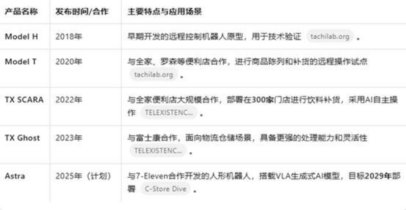 Telexistence的产物线清晰地展现了其手艺从概念验证到贸易化落地,再到将来结构的演进径。其产物系列包罗晚期的Model H和Model T,已实现大规模摆设的TX SCARA,取富士康合做的新一代旗舰产物TX Ghost,以及面向将来的人形机械人Astra。