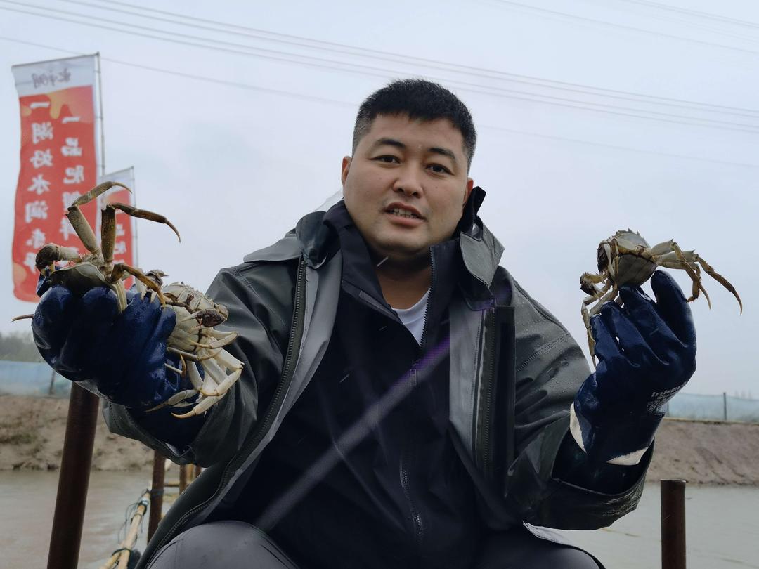 10月17日一早,正在东平湖畔西豆山下的800亩蟹塘里,身着防水皮裤的“90后”小伙顾行志提起水中的蟹笼,一只只肥硕的东平湖大闸蟹爬上趴下。